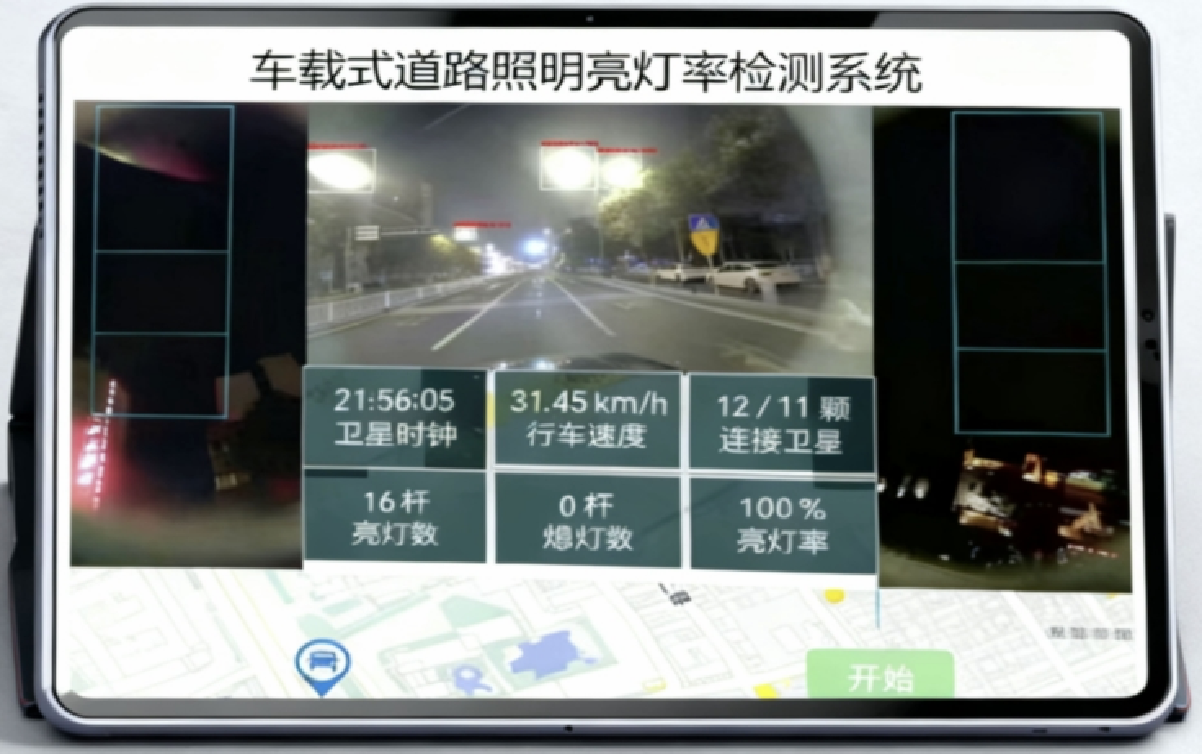 该系统可以对道路照明的路面平均照度、照度均匀度、平均亮度、亮度均匀度进行动态测量,通过北斗卫星定位模块,可以对车辆的行驶轨迹和所测道路的平均照度而成的达标率,通过红(偏高)、绿(正常)、黑(不达标)的三色轨迹线来直观显示。同时该系统基于人工智能图像识别技术,通过高清摄像头采用边缘计算单元与智能算法的深度协同,可实现对路灯的亮灯率动态统计与故障路灯精准定位。系统具有实时数据记录、历史数据查询等功能。(专利号:ZL2025205939490)